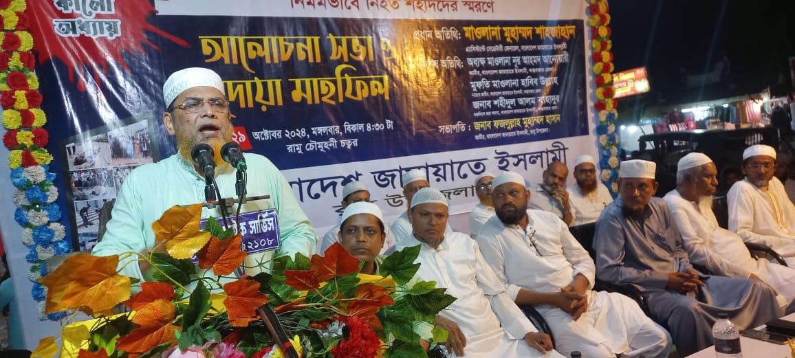 বাংলাদেশ জামায়াতে ইসলামী সহকারী সেক্রেটারি জেনারেল মাওলানা মুহাম্মদ শাহজাহান বলেছেন, ২০০৬ সালের ২৮ অক্টোবর শেখ হাসিনার নির্দেশে আওয়ামী সন্ত্রাসীরা সারাদেশে নৈরাজ্য ও সহিংসতা চালিয়ে দেশকে বিরাজনীতিকরণের দিকে ঠেলে দিয়েছিল। যার ফলে গণতন্ত্র, মানবাধিকার ও ভোটাধিকার সাড়ে পনেরো বছর নির্বাসিত হয়ে পড়েছিল। দেশী-বিদেশী ষড়যন্ত্রের মাধ্যমে আ'লীগ ক্ষমতায় এসে বিডিআর বিদ্রোহের নামে দেশপ্রেমিক সেনা অফিসারদের হত্যা করে দেশের নিরাপত্তা কে নড়বড়ে করে দিয়েছিল। জামায়াত নেতৃবৃন্দ কে বিচারের নামে প্রহসনের মাধ্যমে ফাঁসি দিয়ে ইসলামী চিন্তা- চেতনা, তাহজীব -তামাদ্দুনকে দাবিয়ে রেখেছিল। ৫ আগস্ট ছাত্র -জনতার গণঅভ্যুত্থানে সাড়ে পনেরো বছরের ফ্যাসিস্ট শাসন ব্যবস্থার অবসান হয়েছে; কিন্তু এখনো তাদের রেখে যাওয়া দোসরদের ষড়যন্ত্রের কারণে আগস্ট গণ অভ্যুত্থানের সুফল জনগণ ভোগ করতে পারছেনা। দ্রব্যমূল্যের ঊর্ধ্বগতি, আইন শৃংখলার অবনতি, লোডশেডিং এখনো জনগণের পিছু ছাড়ছে না। বাংলাদেশ জামায়াতে ইসলামী রামু উপজেলা শাখা আয়োজিত ২৯ অক্টোবর সন্ধ্যায় চৌমুহনী স্টেশন চত্বরে অনুষ্ঠিত ২৮ অক্টোবর শহীদের স্মরণে আলোচনা সভা ও দোয়া মাহফিলে প্রধান অতিথির বক্তব্যে তিনি উপরোক্ত কথাগুলো বলেন। উপজেলা আমীর ফজলুল্লাহ মোহাম্মদ হাসানের সভাপতিত্বে অনুষ্ঠিত সভায় বিশেষ অতিথির বক্তব্য রাখেন জেলা জামায়াতের আমীর অধ্যক্ষ মাওলানা নূর আহমদ আনোয়ারী, নায়েবে আমীর মুফতী মাওলানা মুহাম্মদ হাবিবুল্লাহ, জেলা জামায়াতের শূরা সদস্য ও সাবেক সদর উপজেলা ভাইস চেয়ারম্যান শহিদুল আলম বাহাদুর। প্রধান অতিথি আরো বলেন, এখনো বাংলাদেশের বিভিন্ন পর্যায়ে বৈষম্য বিরাজমান। আমরা যদি সত্যিকার অর্থে বৈষম্য মুক্ত বাংলাদেশ গড়ে তুলতে চায় তাহলে আমাদের কে ইসলামের ন্যায় ও ইনসাফ মেনে চলতে হবে। একমাত্র ইসলামী আদর্শ 'ই বৈষম্য মুক্ত সমাজ প্রতিষ্ঠার নিশ্চয়তা দিতে পারে। তাই জামায়াতে ইসলামী সমাজ থেকে সকল ভেদাভেদ তুলে একটি সত্যিকারের বৈষম্য মুক্ত বাংলাদেশ বিনির্মাণের কাজ চালিয়ে যাচ্ছে। তিনি ২০০৬ সালের ২৮ অক্টোবর গণতন্ত্র ও ভোটাধিকার হরণের মহড়া উল্লেখ করে উক্ত ঘটনার সাথে জড়িতদের দৃষ্টান্তমূলক শাস্তি নিশ্চিত করার জন্য সরকারের প্রতি আহ্বান জানান। উপজেলা সেক্রেটারি আ ন ম হারুনের সঞ্চালনায় অনুষ্ঠিত আলোচনা সভায় আরো বক্তব্য রাখেন উপজেলা নায়েবে আমীর অধ্যক্ষ মাওলানা মুহাম্মদ রফিক, সহ- সেক্রেটারি মাওলানা নূরুল হাকিম, উলামা বিভাগ সভাপতি মাওলানা বশির উদ্দিন, শ্রমিক কল্যাণ ফেডারেশন উপজেলা সভাপতি মোহাম্মদ মোক্তার আহমদ, যুব বিভাগ সভাপতি মাহবুবুর রহমান, স্থানীয় জামায়াত নেতা মাওলানা হাবি
