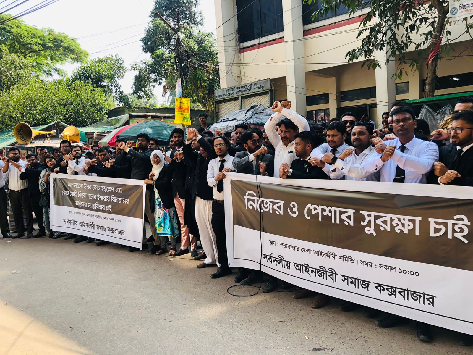 নিজের ও পেশার সুরক্ষার দাবিতে প্রতীকি হাতকড়া পড়ে কক্সবাজারে মানববন্ধন ও অবস্থান কর্মসূচি পালন করেছে আইনজীবীরা।