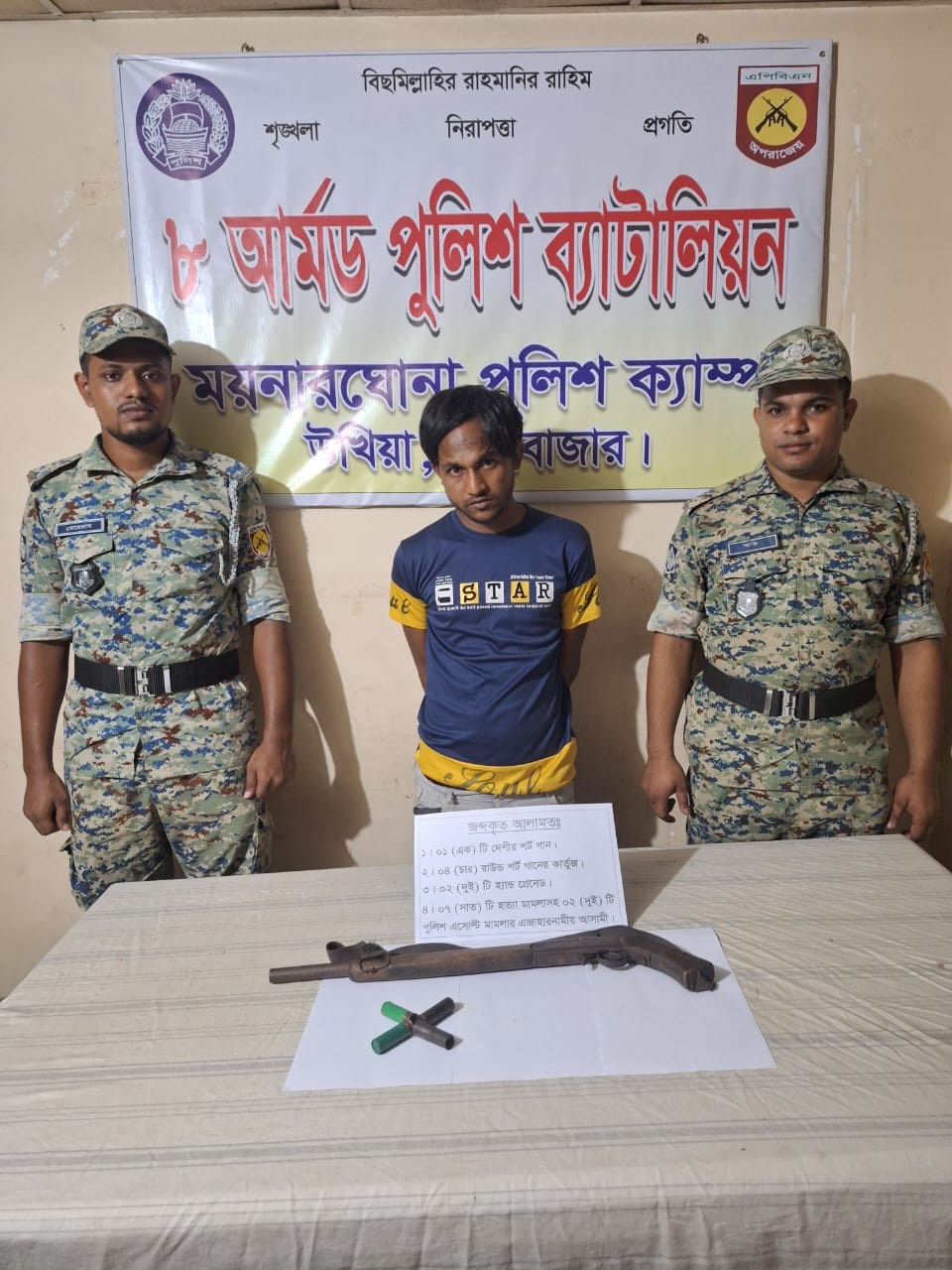 “ পরে গ্রেপ্তার ব্যক্তির সাথে থাকা ব্যাগ থেকে দেশিয় তৈরী ১ বন্দুক, ৪ টি কার্তুজ ও ১ টি হ্যান্ডগ্রেনেড পাওয়া যায়। “