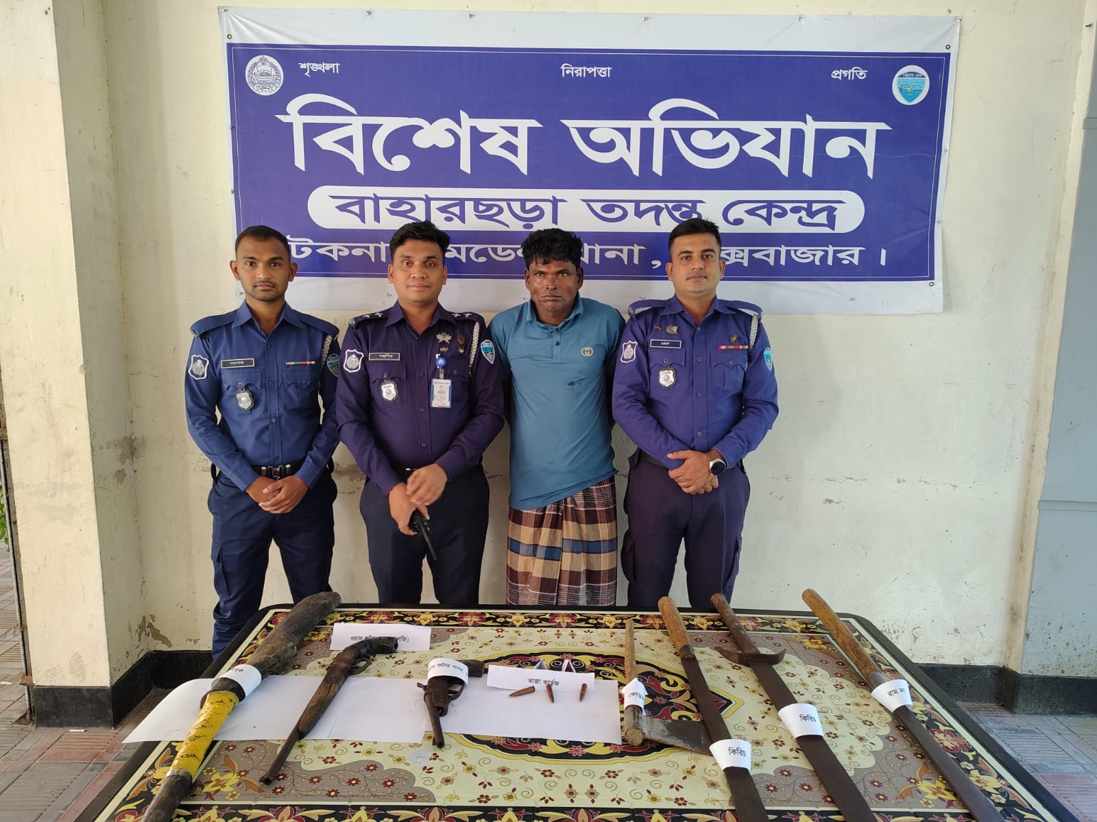 “ পরে গ্রেপ্তার ব্যক্তির স্বীকারোক্তি মতে, বাহারছড়া ইউনিয়নের উত্তর শিলখালী এলাকায় জনৈক জলিলের বাড়ীর সামনে থাকা লাকড়ির স্তুপে লুকিয়ে রাখা অবস্থায় পাওয়া যায় দেশিয় তৈরী ৩ টি বন্দুক, ৩ টি গুলি, ২টি কিরিচ দা, ১ টি রামদা ও ১ টি চাইনিজ কুড়াল। “
