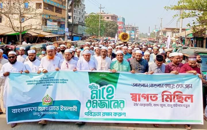 পবিত্র মাহে রামাদান কে স্বাগত জানিয়ে ২৮ ফেব্রুয়ারি জেলাব্যাপী জামায়াতে ইসলামীর বিভিন্ন উপজেলা ও ইউনিয়ন শাখার উদ্যোগে স্বাগত মিছিলের আয়োজন করা হয়। মিছিলোত্তর সমাবেশে বক্তারা বলেছেন, প্রতিবছরের মতো আবারো পবিত্র মাহে রামাদান আমাদের মাঝে উপস্থিত হয়েছে। কুরআন নাজিলের মাস হিসেবে মাহে রামাদান কে কুরআনের সমাজ প্রতিষ্ঠার কাজে লাগাতে হবে। কুর'আনিক সমাজ প্রতিষ্ঠার মাধ্যমে একটি ইনসাফপূর্ণ ও বৈষম্যহীন বাংলাদেশ বিনির্মাণ সম্ভব। সামাজিক, রাজনৈতিক, অর্থনৈতিক ও সাংস্কৃতিক বৈষম্য দূর করতে হলে ইসলামী আদর্শের ভিত্তিতে সমাজকে সাজাতে হবে। মাহে রামাদান আমাদের কে প্রতি বছর সেই ডাক দিয়ে যাচ্ছে। বক্তারা আরো বলেন, রামাদান কে সামনে রেখে এক শ্রেণির অসাধু ব্যবসায়ী নিত্য প্রয়োজনীয় দ্রব্যের মূল্য বৃদ্ধির জন্য মজুদ গড়ে তুলেছে। আমরা অবিলম্বে এ সকল অসাধু ব্যবসায়ী কে আইনের আওতায় এনে দৃষ্টান্তমূলক শাস্তির দাবি জানাচ্ছি। বাজারে নিত্যপ্রয়োজনীয় পণ্যের সরবরাহ স্বাভাবিক রাখতে বাজার মনিটরিং জোরদার করার দাবি জানাচ্ছি। আমরা বাজার এবং সিন্ডিকেট নিয়ন্ত্রণে সরকারের ব্যর্থতা দেখতে চাই না। বক্তারা আরো বলেন, রামাদানের পবিত্রতা রক্ষায় দিনের বেলা হোটেল - রেস্তোরাঁ বন্ধ রাখতে হবে। অনলাইনসহ দোকান-পাট ও সিনেমা হলে অশ্লীলতা ও বেহায়াপনা প্রদর্শনী বন্ধ রাখতে হবে। যথাযথ মর্যাদা ও ভাবগাম্ভীর্যের সাথে রামাদান অতিবাহিত করার নিরাপদ ও শান্তিপূর্ণ পরিবেশ নিশ্চিত করার জন্য বক্তারা অনুরোধ জানান।
