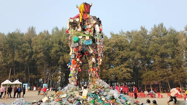 সাকলাইন আলিফ : কক্সবাজার সমুদ্র সৈকতের সুগন্ধা পয়েন্টে দাঁড়িয়ে আছে বিশাল আকৃতির এক প্লাস্টিকের তৈরি দানব। সমুদ্রে প্লাস্টিক দূষণ রোধে জনসচেতনতা সৃষ্টির লক্ষ্যে এ দানব তৈরি করা হয়েছে। সৈকতেই আগত